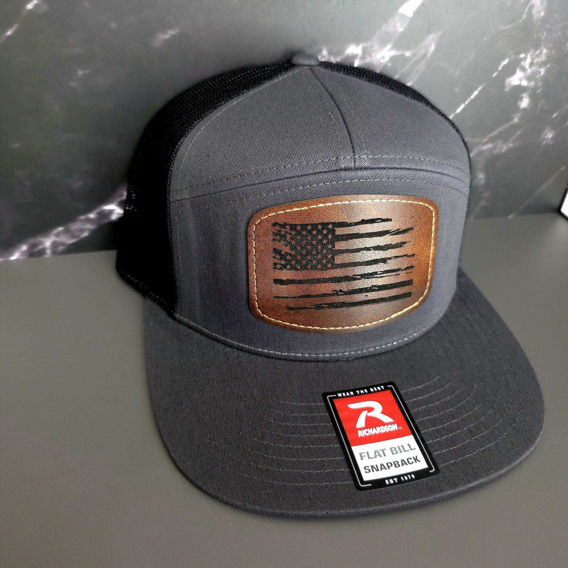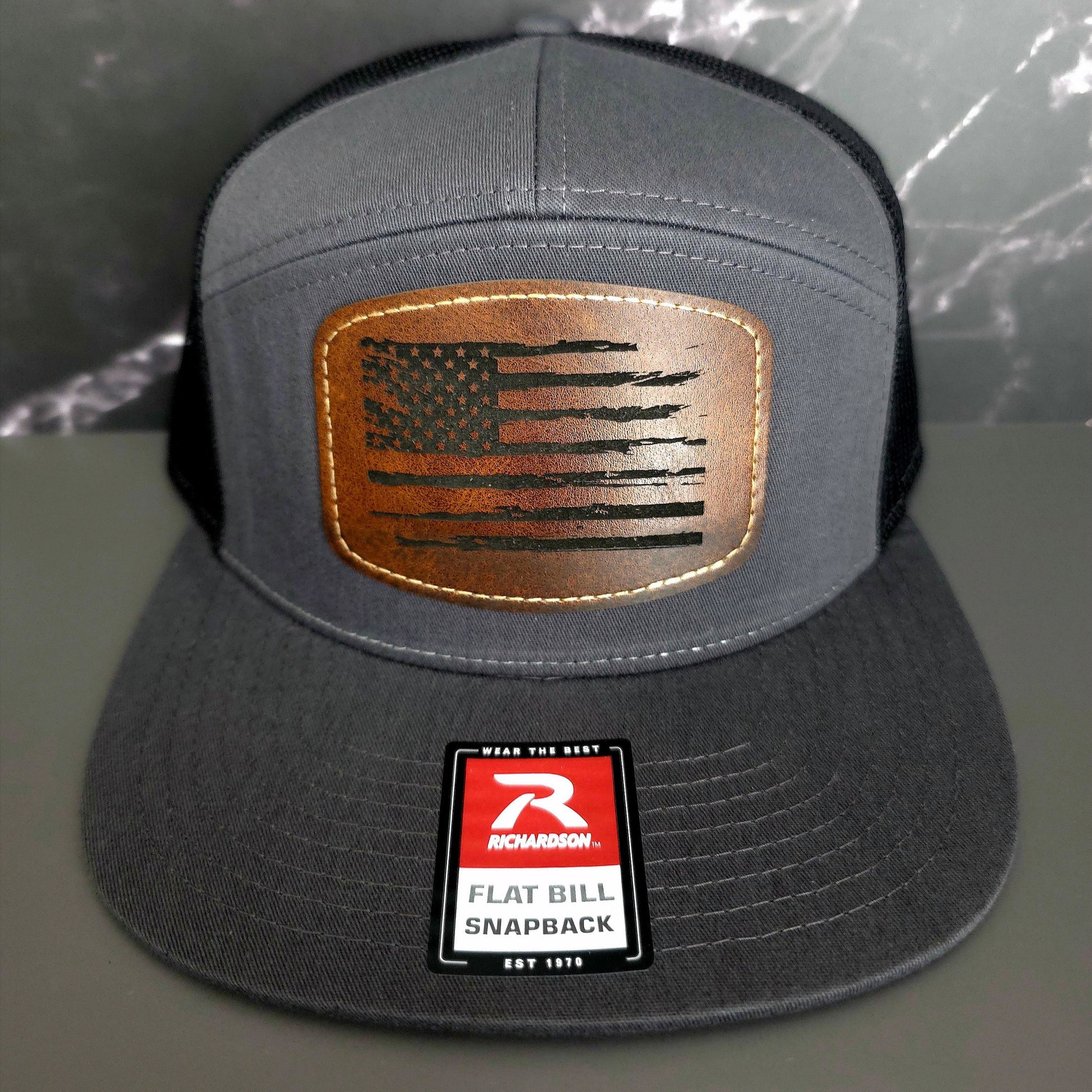 2.5in x 3.5in Leather patch with American flag heat pressed.