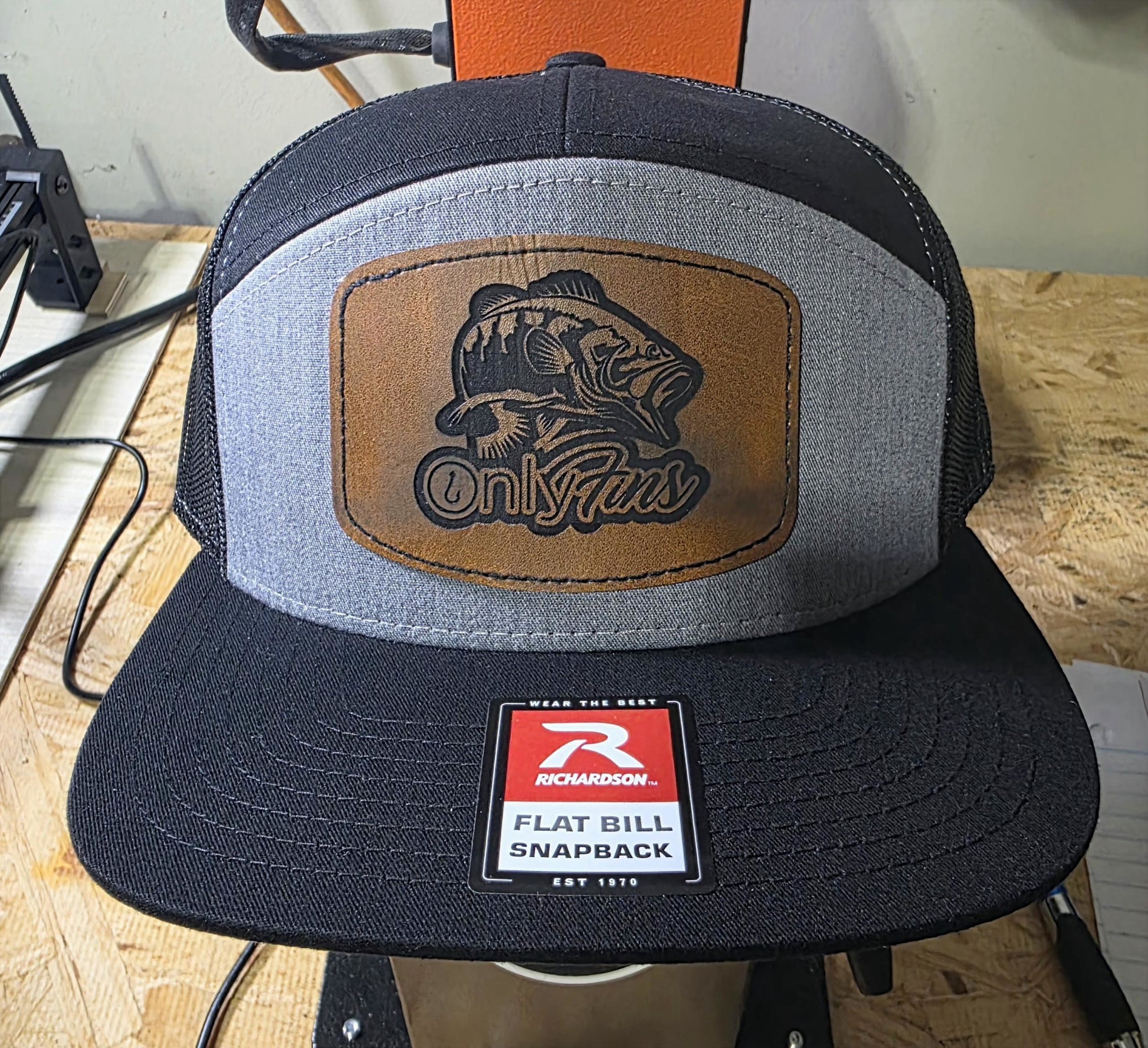 2.5in x 3.5in Leather patch with Only Fins heat pressed.